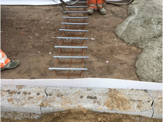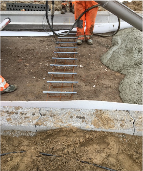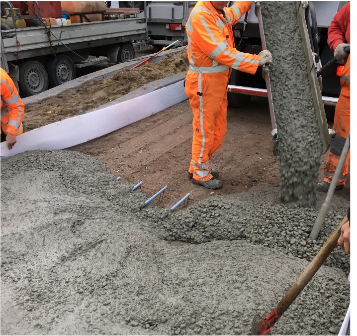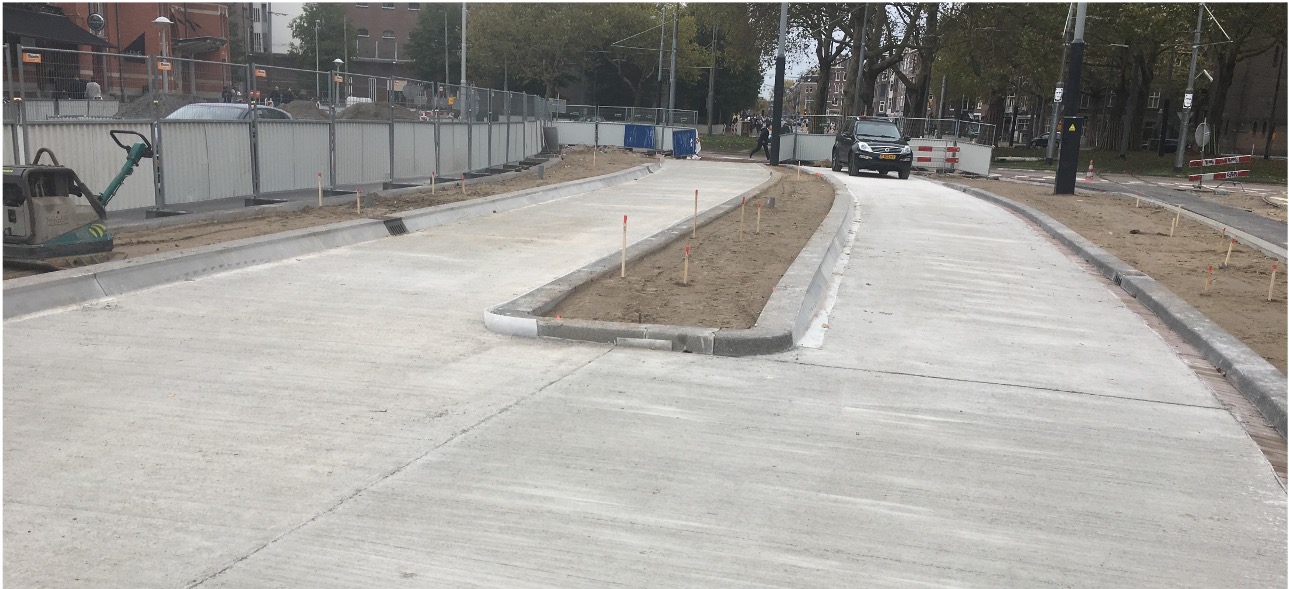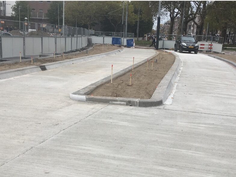 The bus stops and bus lines in the city of Amsterdam was constructed by the specialist company Den Ouden. The 22 cm fibre reinforced concrete slab on soil is constructed with cutting joints each 7,00 m including dowels which allows horizontal movement but prevented vertical movement of the slab.